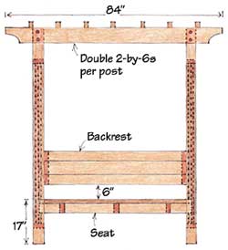 bench has two pairs of 2-by-6 beams connecting the posts and attached