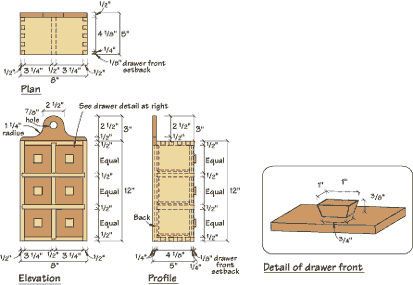Cut the drawer fronts to size, then make the knobs. Cut a 3/8" x 1" x 8" strip of cherry, beveling the sides at a 25—degree angle. Then cut the knobs off at 1" intervals, again beveling the sides at 25 degrees. Use either a band saw to cut the knobs to shape, or sand them to shape after separating. Attach the knobs to the drawer fronts with #4 flathead screws and glue. Then glue the fronts to the drawer boxes.